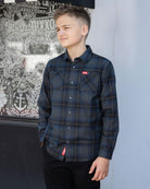 Made for all-day comfort and nonstop movement, the Youth Benchmark Flannel delivers classic plaid style in a kid-friendly fit. Featuring a grey, black, blue, and white pattern with an easy snap-front design, this flannel is built to keep up wherever the day goes.