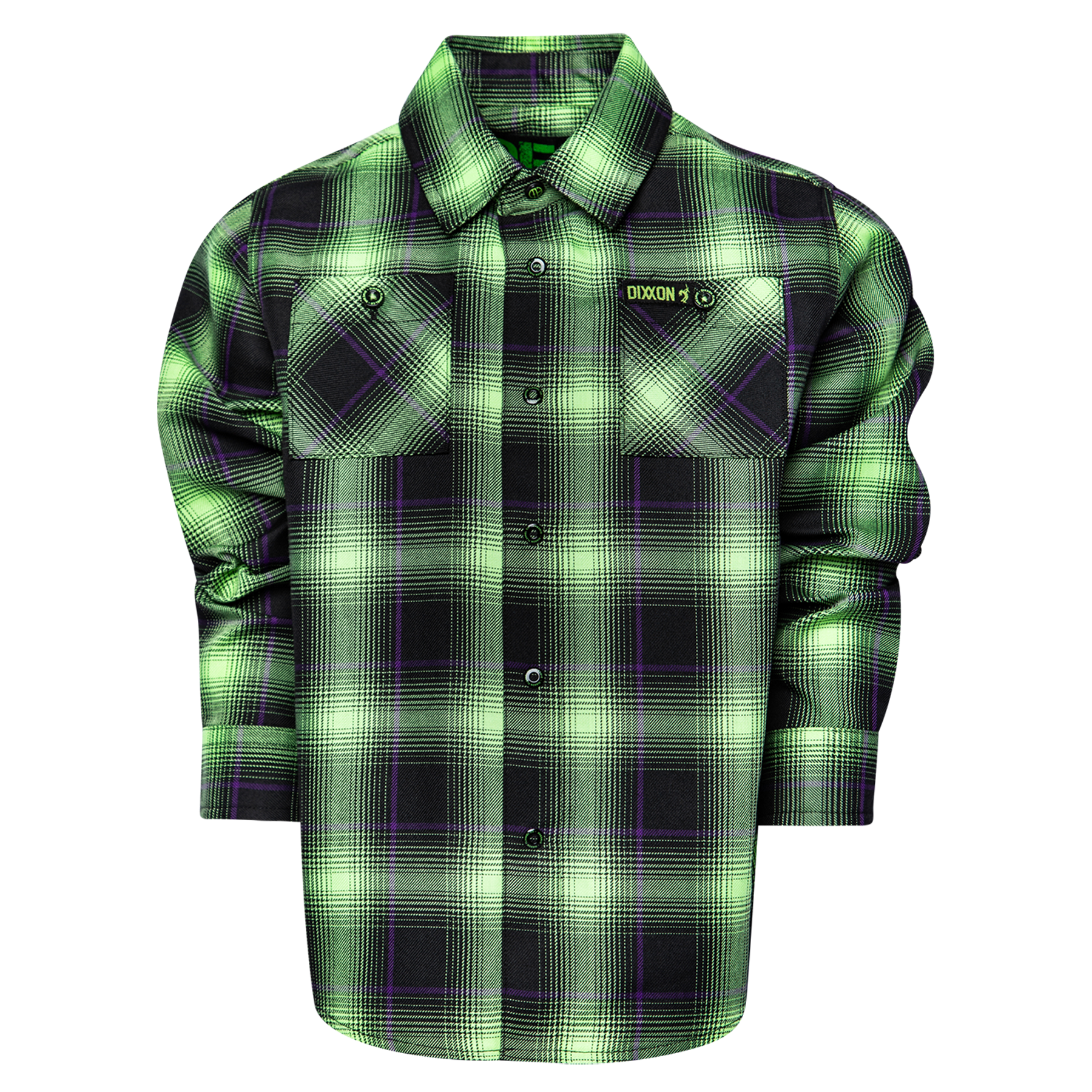 Turn it up and let them stand out. The Youth Dimebag Darrell Flannel brings bold energy with a green, black, and purple plaid pattern inspired by legendary style. Built tough for everyday wear while keeping things comfortable, this flannel is perfect for kids who like to rock their own look.