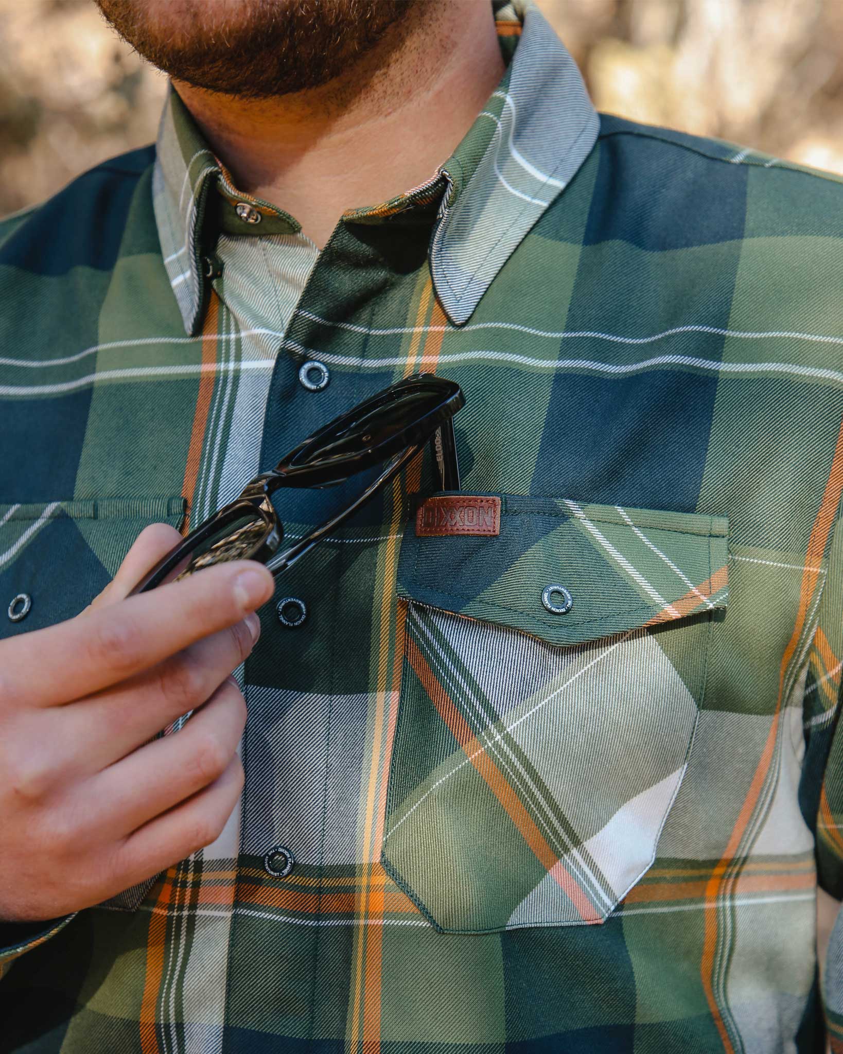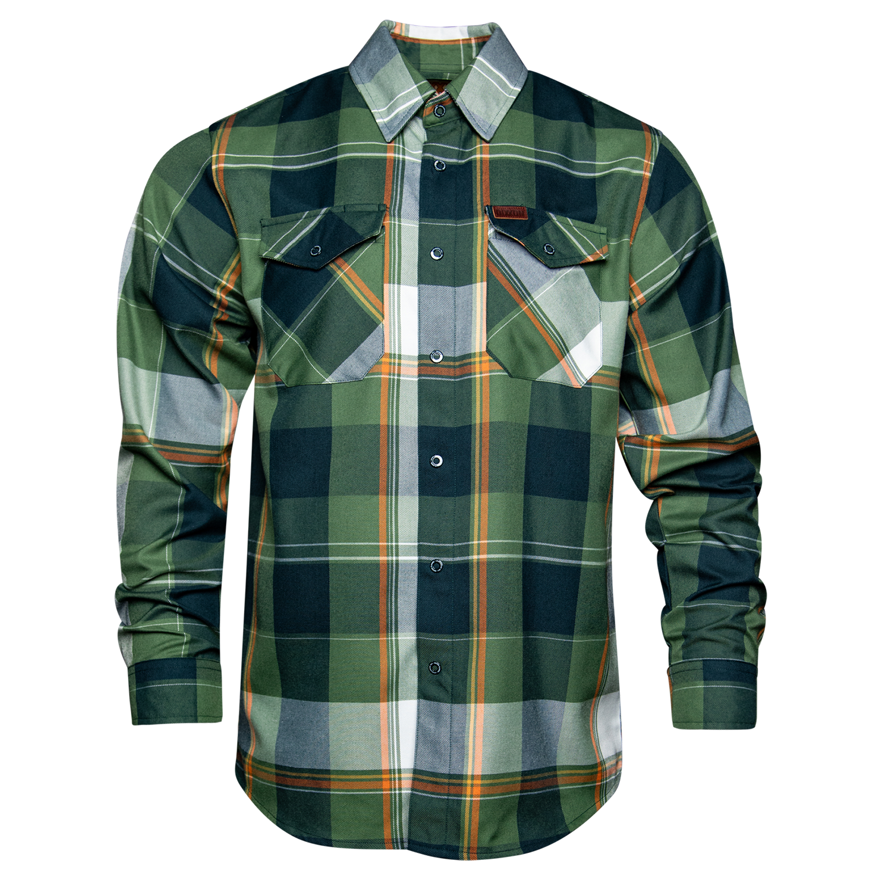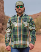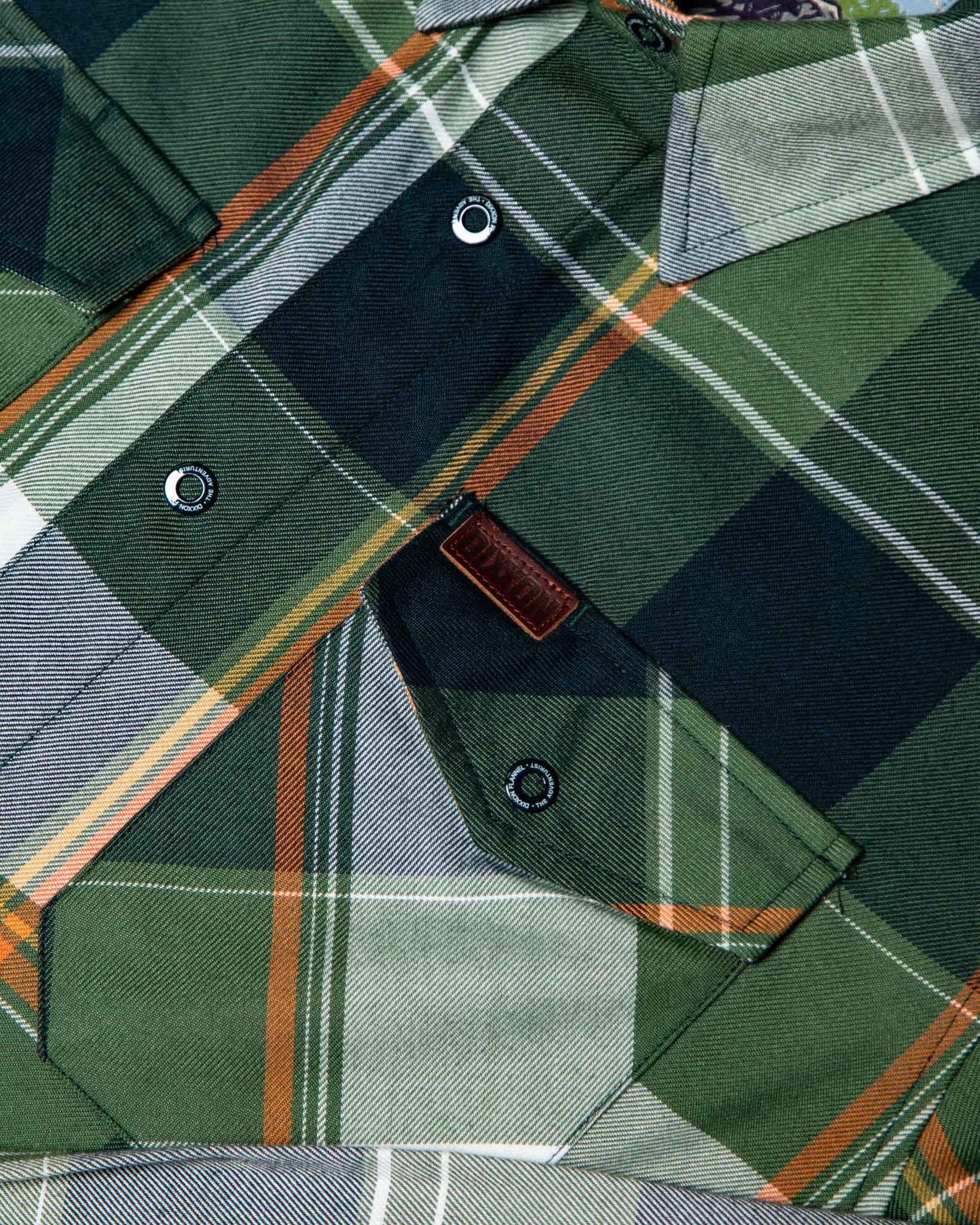 Inspired by open roads, fresh air, and the pull of what’s next, The Adventurist Flannel is built for those who never sit still for long. Featuring a rich green, white, orange, and gold plaid pattern, this snap-front flannel blends classic Dixxon durability with a bold, outdoors-ready edge.