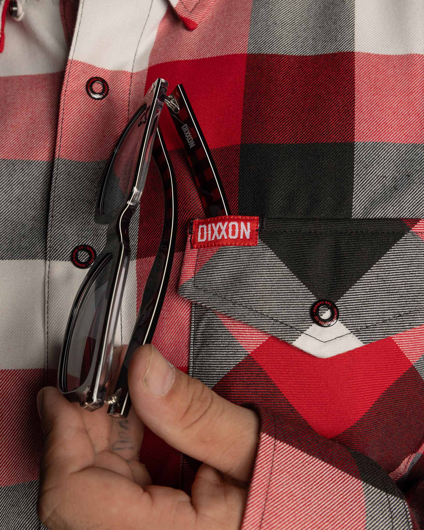 Celebrating a decade of grit, craftsmanship, and unmistakable Dixxon style, the Hammer 10 Yr Anniversary Flannel is built to honour where it all began. Featuring a bold red, black, and white plaid pattern, this snap-front staple delivers rugged durability, everyday comfort, and a timeless look worthy of the milestone.
