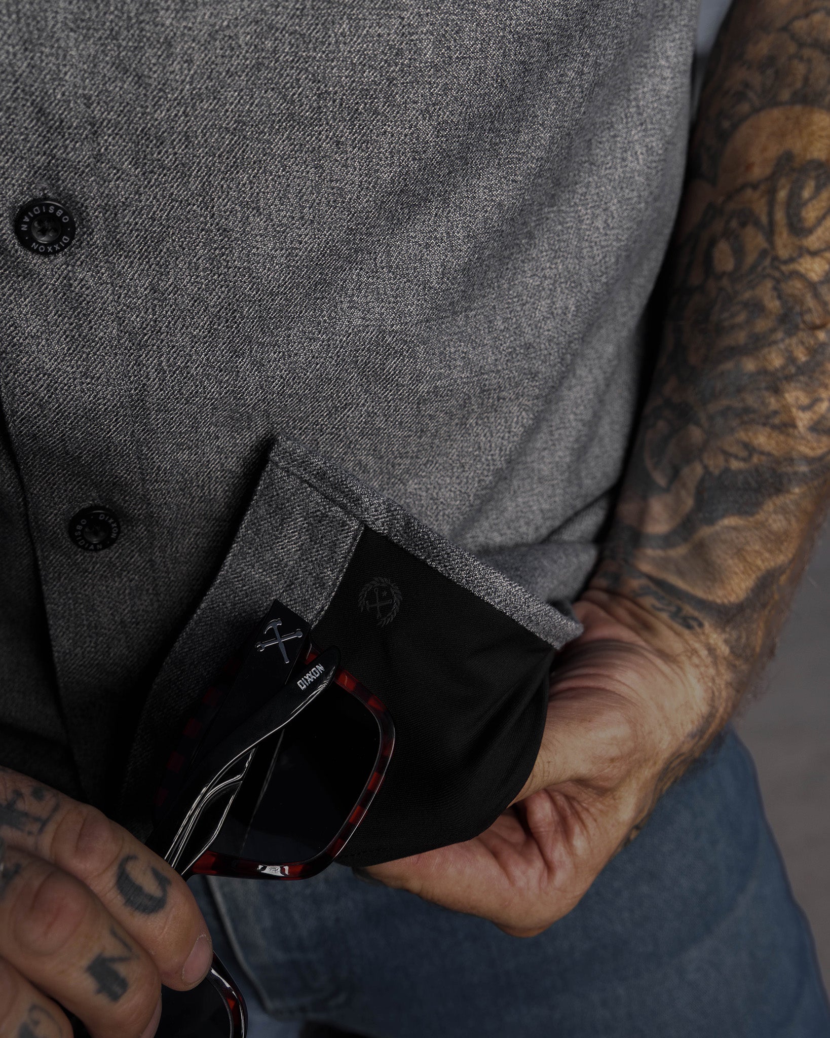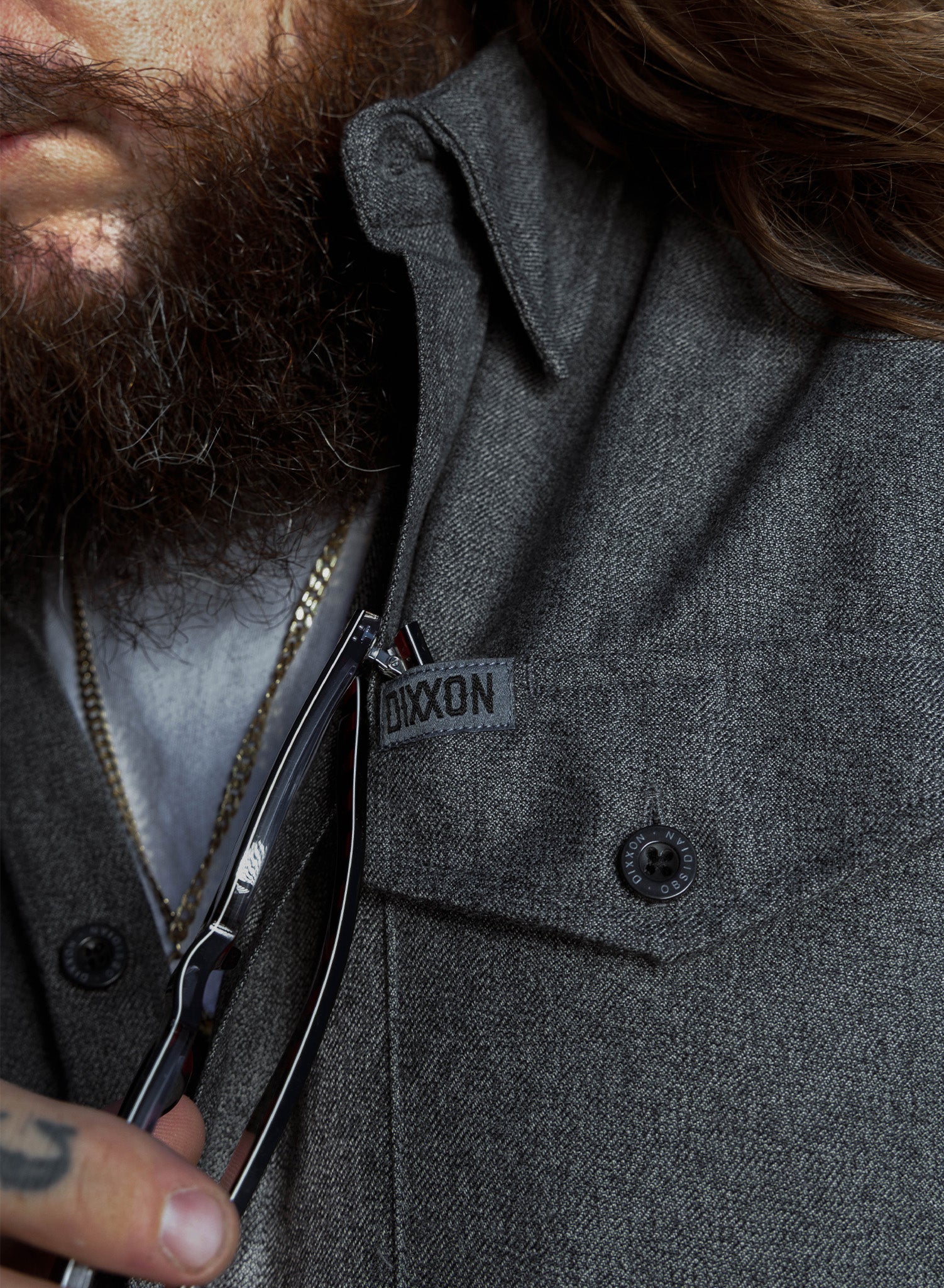 • Dixxon brand tag on the left chest pocket