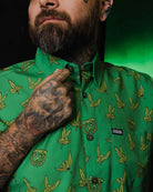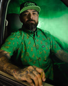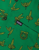Blaze your own trail in the Reefer Party Shirt. Styled in a vivid green with cannabis leaf icons throwing up playful hand signs and custom Dixxon crests throughout, this bold button up was made for the loud and the proud. Crafted with our signature party blend material for all-day comfort and wrinkle-free wear, it's the perfect collab between couch lock and drip drop. Wherever the smoke settles, this shirt brings the heat.