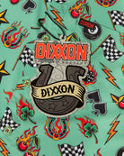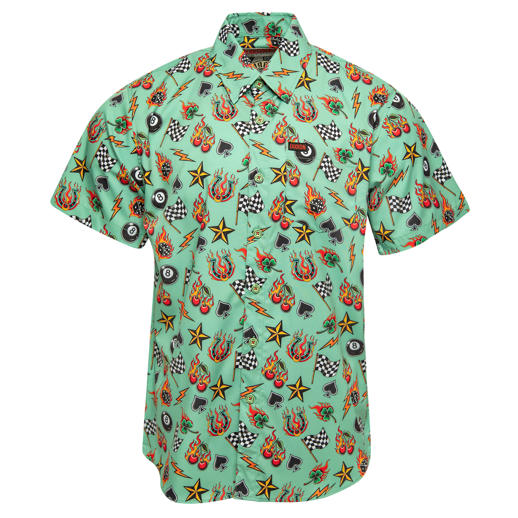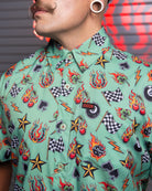 Throw it back to bold graphics and louder nights with the 1996 Party Shirt. Featuring a mint green base loaded with flaming cherries, lucky clovers, checkered flags, dice, lightning bolts, and classic tattoo-inspired icons throughout, this button-up is built for high-energy weekends and statement-making style.