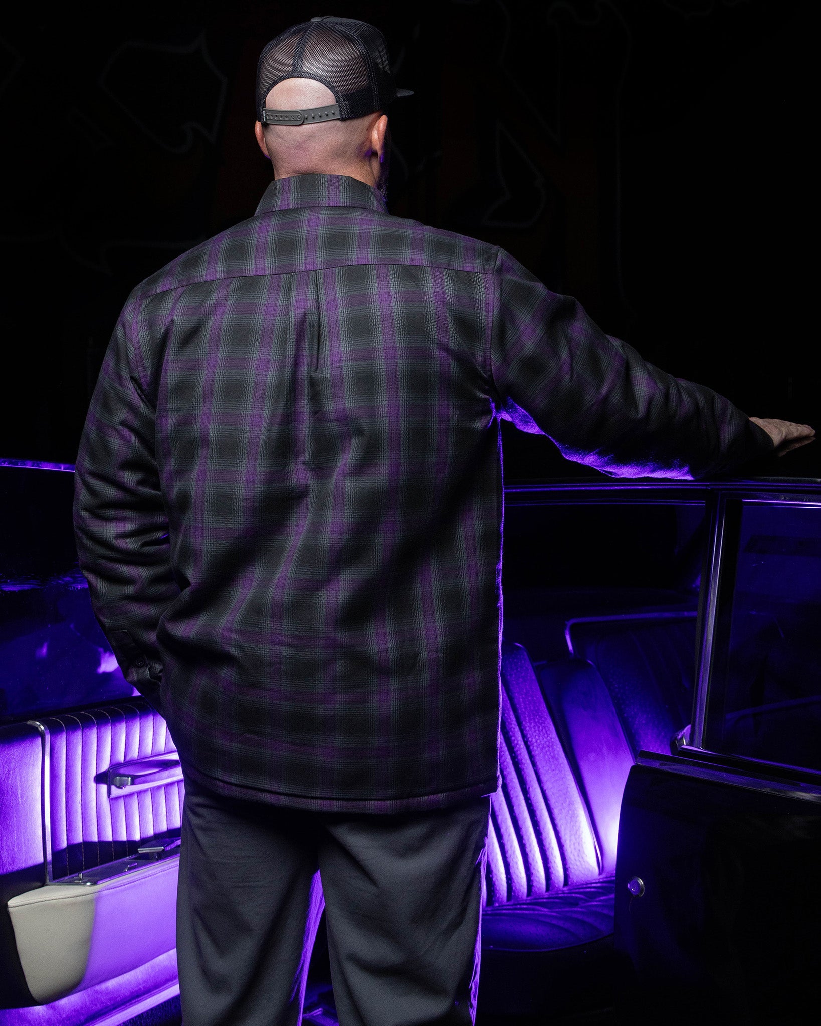 Shadowy and sharp, the Forum Quilted Flannel Jacket pairs a black, grey, and purple plaid exterior with a diamond-stitched quilted liner for warmth without bulk. Built for long days and late nights, its wrinkle-resistant shell and work-ready details make this your go-to layer.