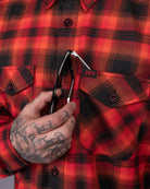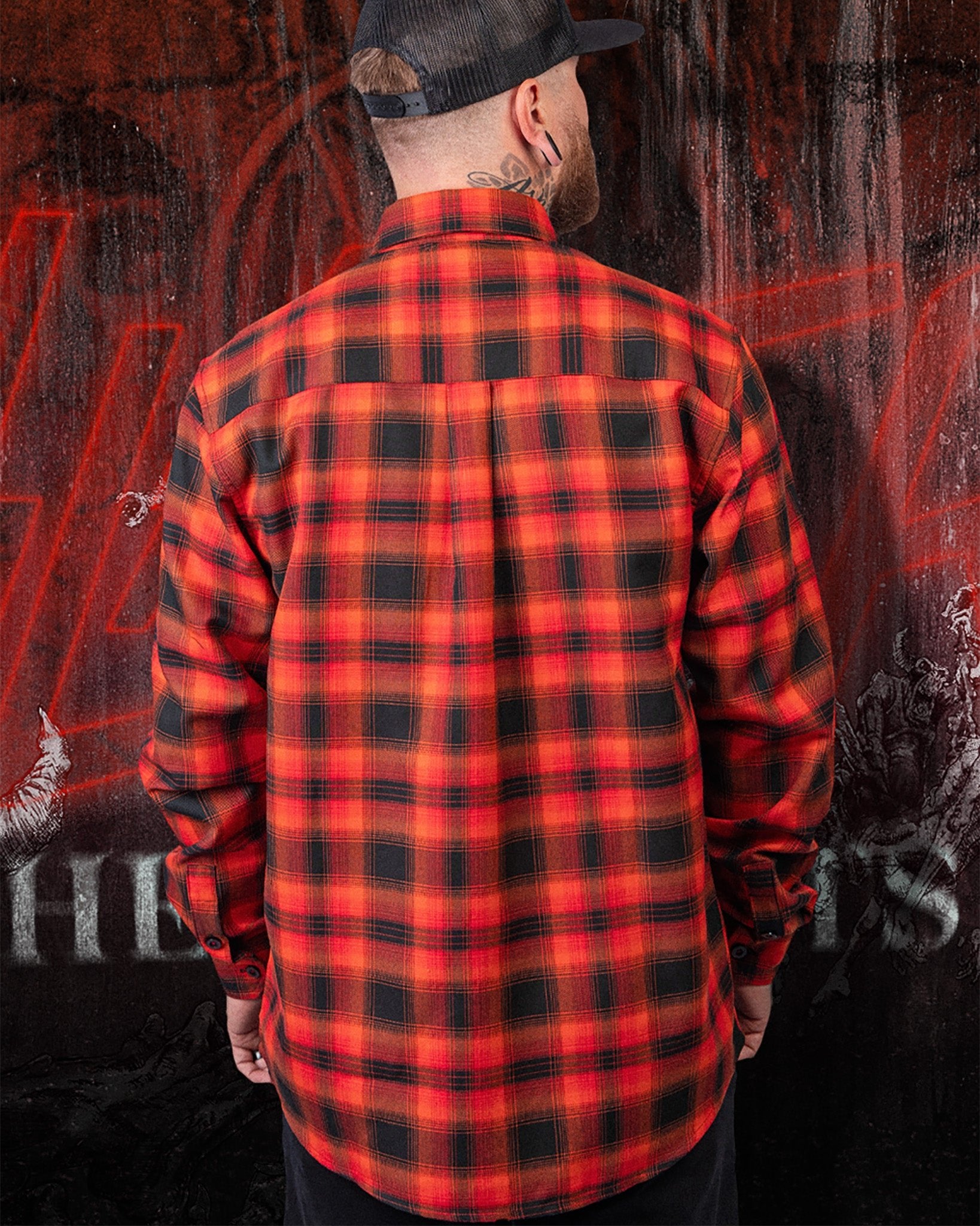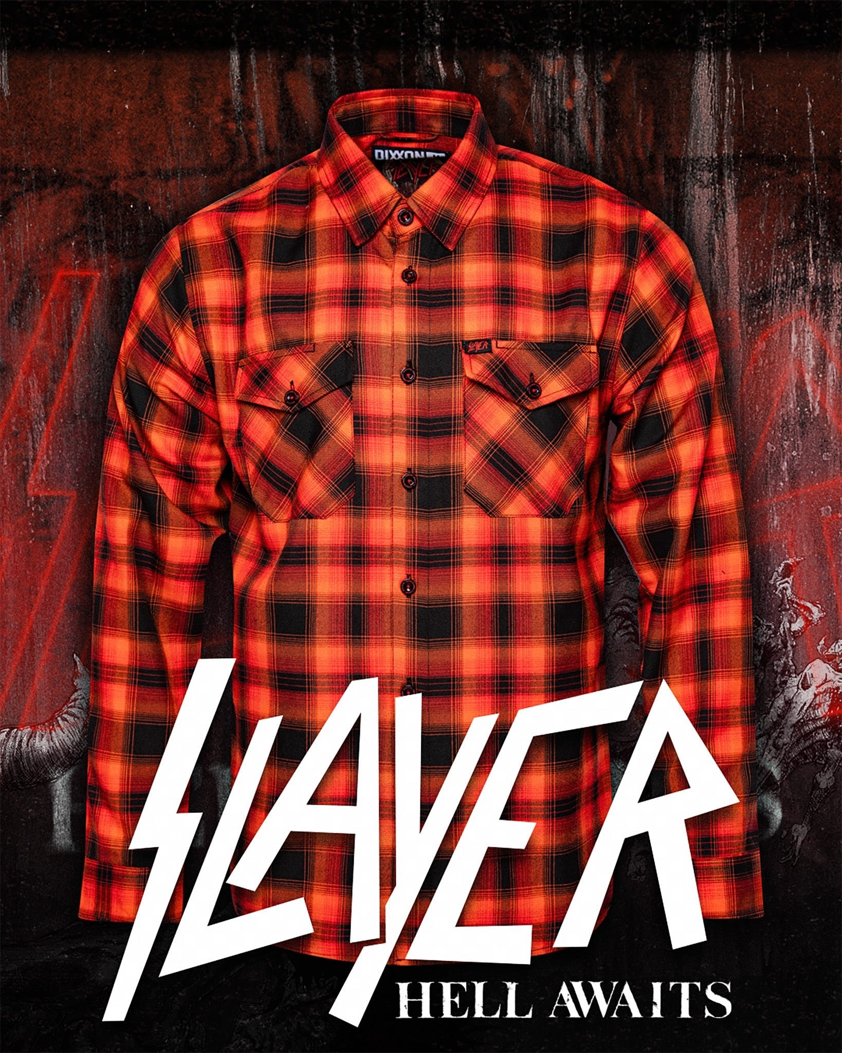 Summon the darkness and wear it loud. The Slayer Hell Awaits Flannel brings iconic metal energy to a classic Dixxon staple, featuring a bold orange, red, and black plaid pattern inspired by Slayer’s unmistakable legacy. Built with a button front closure and durable construction, this flannel is made for long nights, loud shows, and living unapologetically.