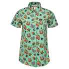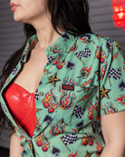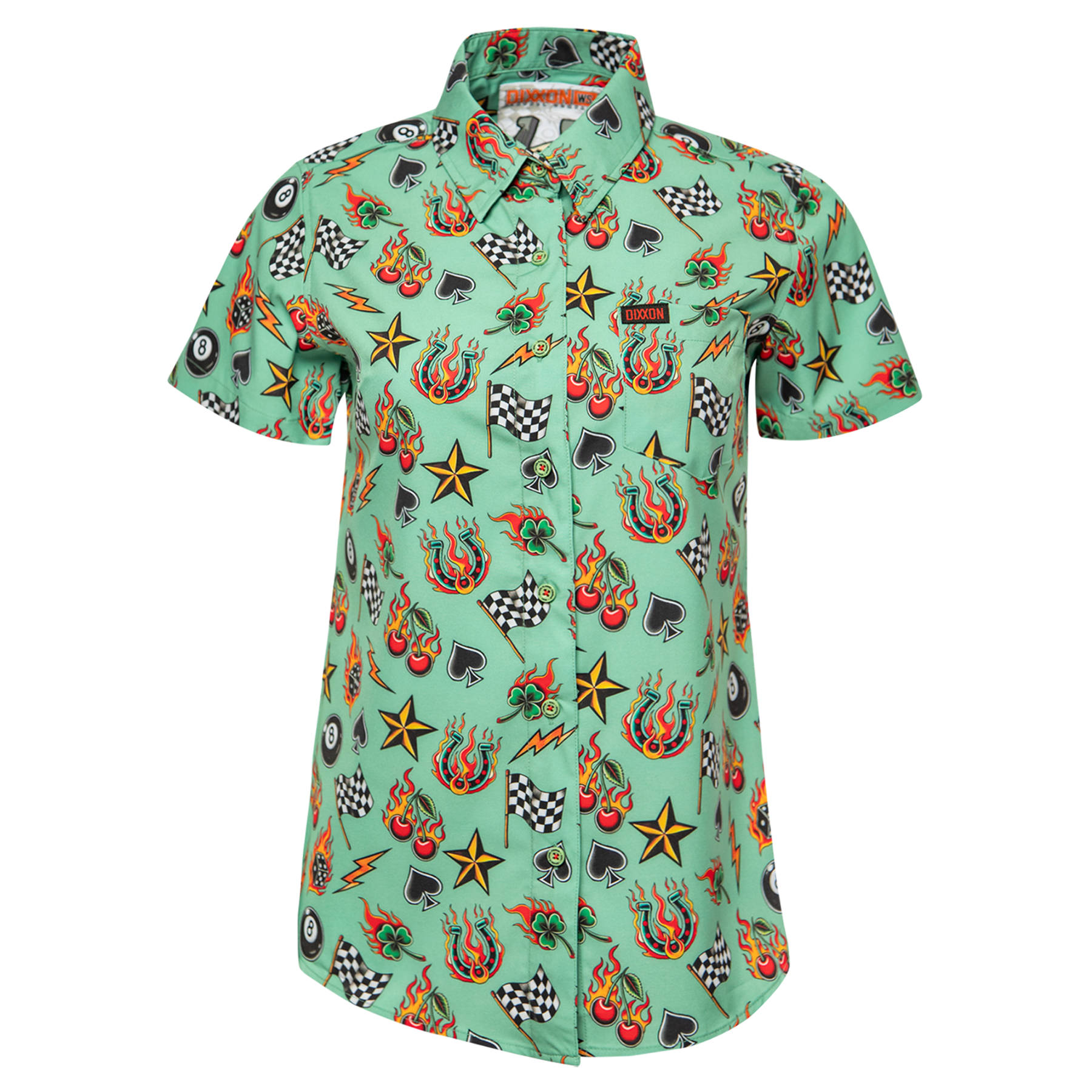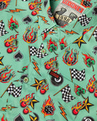 Turn up the nostalgia with the Women’s 1996 Party Shirt. Set on a mint green base with bold flaming cherries, lucky clovers, checkered flags, lightning bolts, and vintage tattoo-inspired graphics throughout, this style delivers playful edge with an easy, flattering fit.