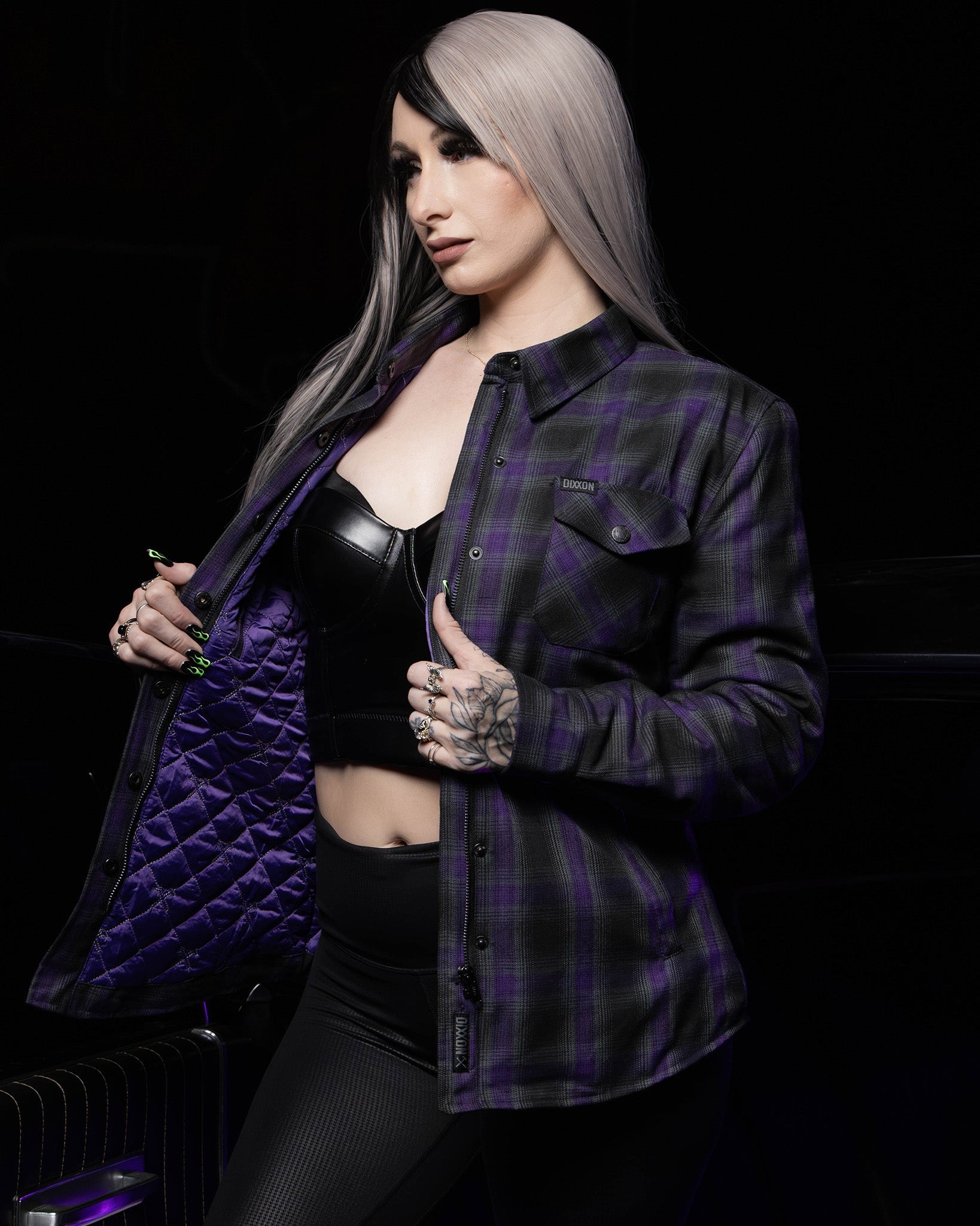 • Women's black, grey, and purple plaid patterned flannel jacket
