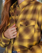 Traditions, legacy, and the beauty everywhere in between. Family memories of americas favorite pastime and doing it all with an incredible cause attached. This one is about COMMUNITY. The Women's Friar Flannel honors resilience, strength, and unwavering support. With its warm gold and brown plaid pattern and snap button closures, this heritage piece is as meaningful as it is versatile‚ a style designed to be worn with pride in every season.