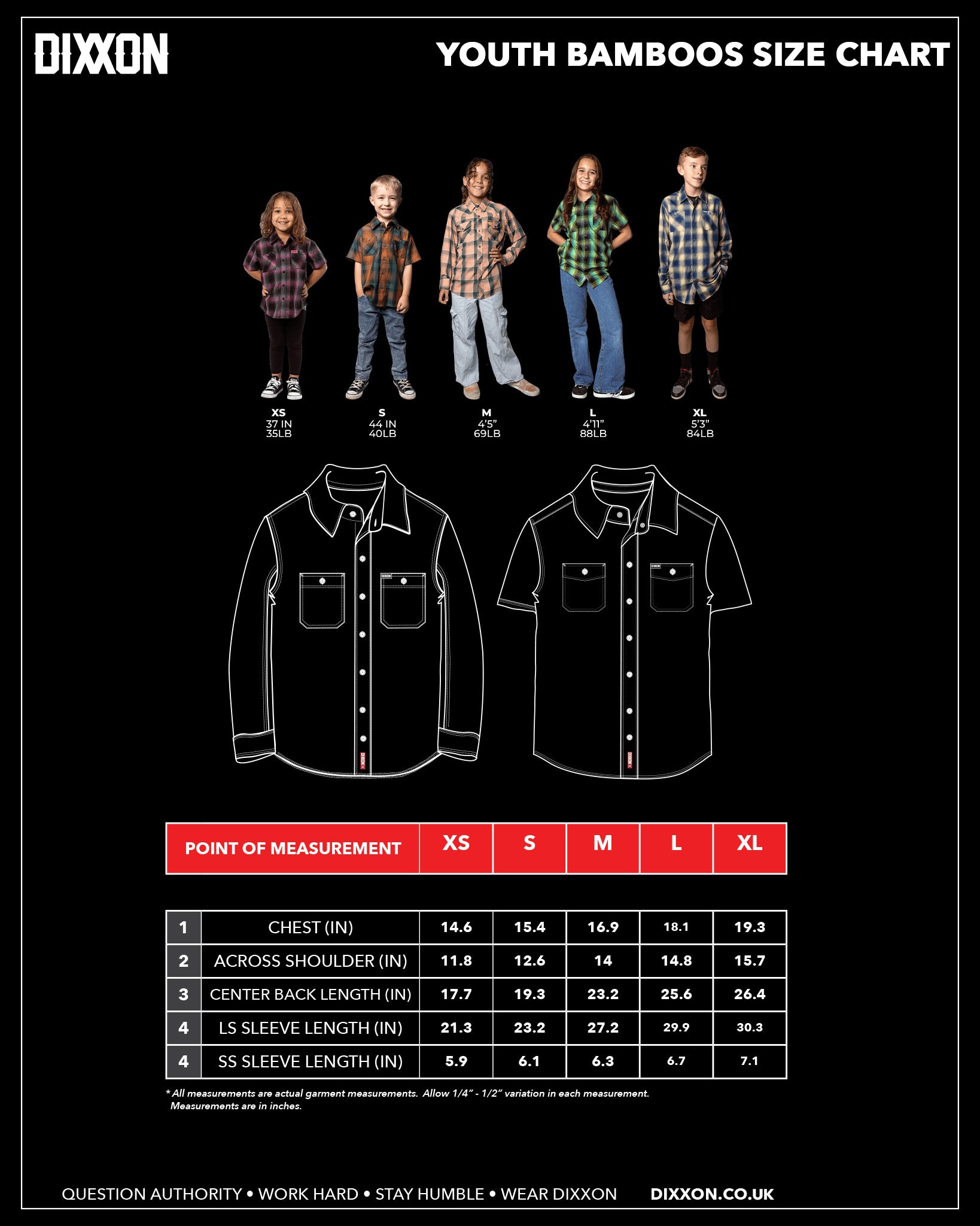 *This size chart includes measurements for all men's flannels, bamboo shirts, party shirts, work shirts, and jackets.