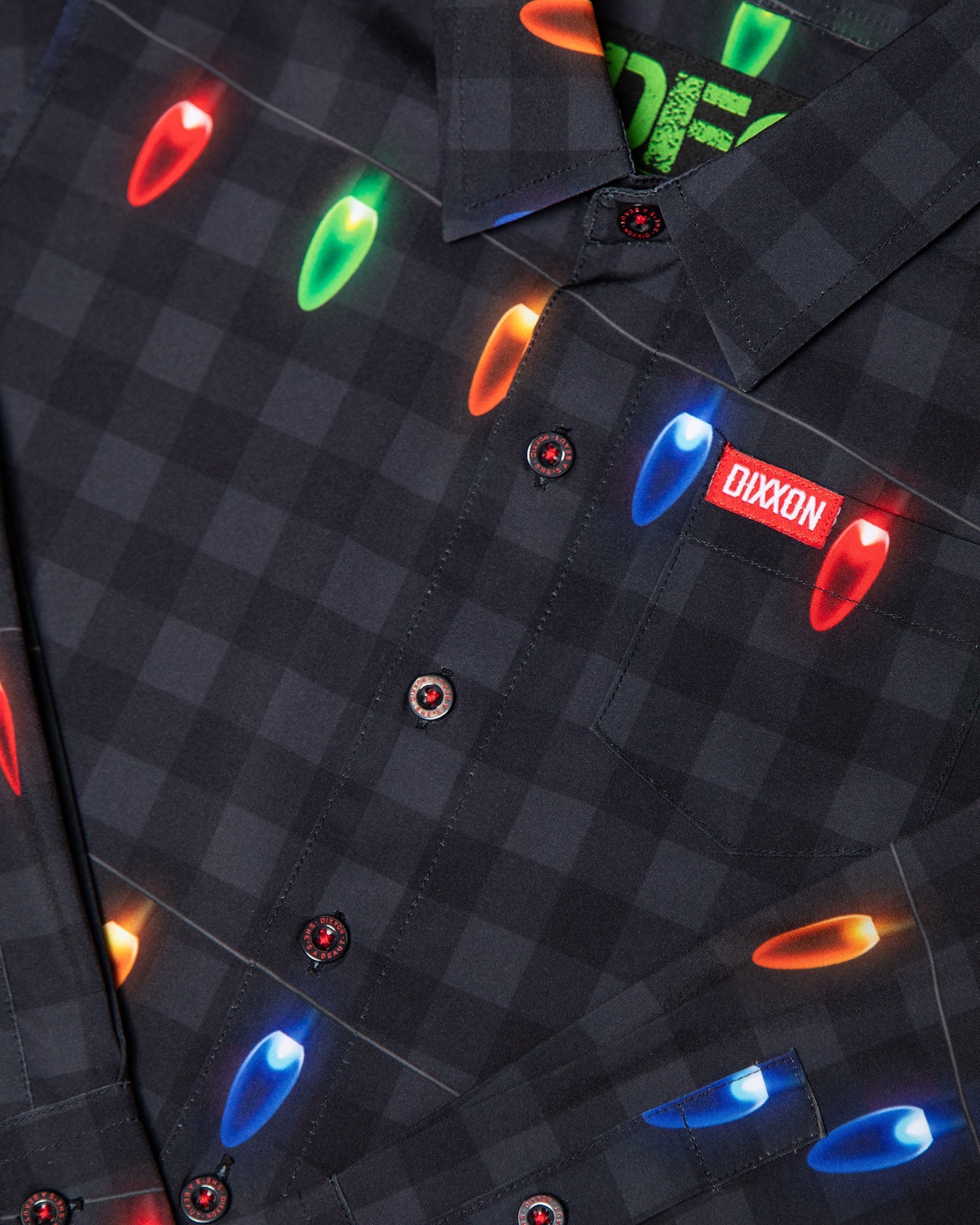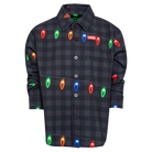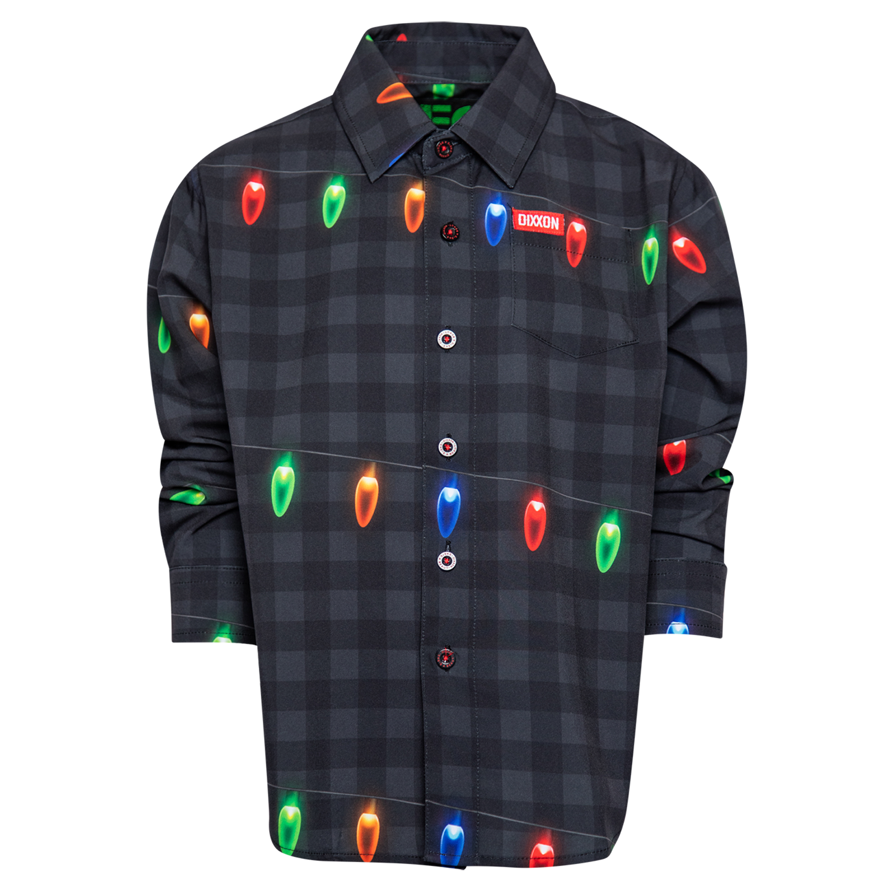 Bring the festive fun with the Youth Clark Long Sleeve Party Shirt. Featuring a black checkered base and colourful string light print, this button-up keeps kids looking sharp while showing their holiday spirit.