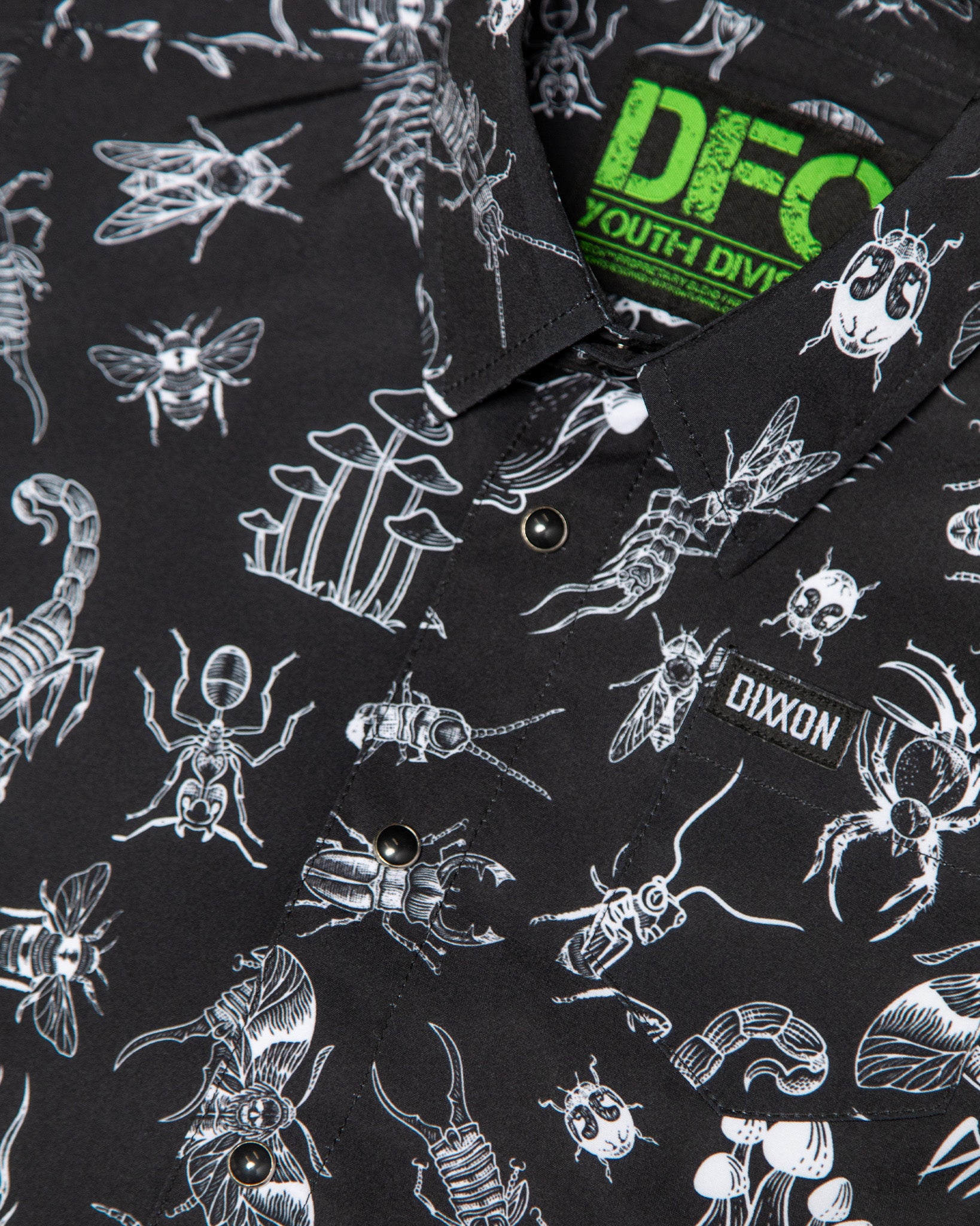 Add some creepy-crawly vibes to an everyday essential with the Youth Crawler Party Shirt. Covered in eerie insect and arachnid illustrations across a black background, this bold button up brings spooky style that’s perfect for little rippers who like things a little wild. Lightweight, breathable, and built with Dixxon’s signature party blend material, it’s ready for whatever chaos the day brings.