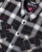 Designed with a bold edge and an easygoing fit, the Women’s Outlet Flannel mixes contrast and confidence in a black, white, pink, and gold plaid that turns heads without sacrificing comfort. A statement flannel that still feels like an everyday staple.