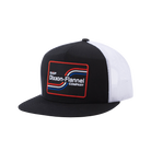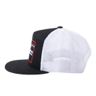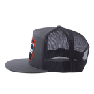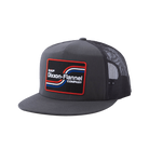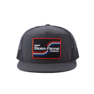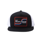 • Red, black, white, and blue DXF embroidered logo patch at front