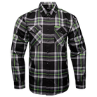 • Men's black, grey, white, and green plaid patterned flannel shirt