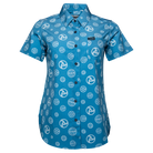 The Women's Sprocket Party Shirt delivers easy comfort with industrial edge. With a bold blue base and light blue sprocket icons throughout, this short sleeve button up is made with our signature party blend fabric for a breathable, stretch-infused fit that's soft, stylish, and built to last through every season of fun.